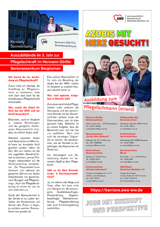 Werde jetzt Teil unseres Teams und starte zum 01.04. oder 01.10. in einem unserer Seniorenzentren in Bergkamen, Bönen, Hamm, Lünen, Schwerte oder Unna als Auszubildender zum Pflegefachmann (m/w/d).